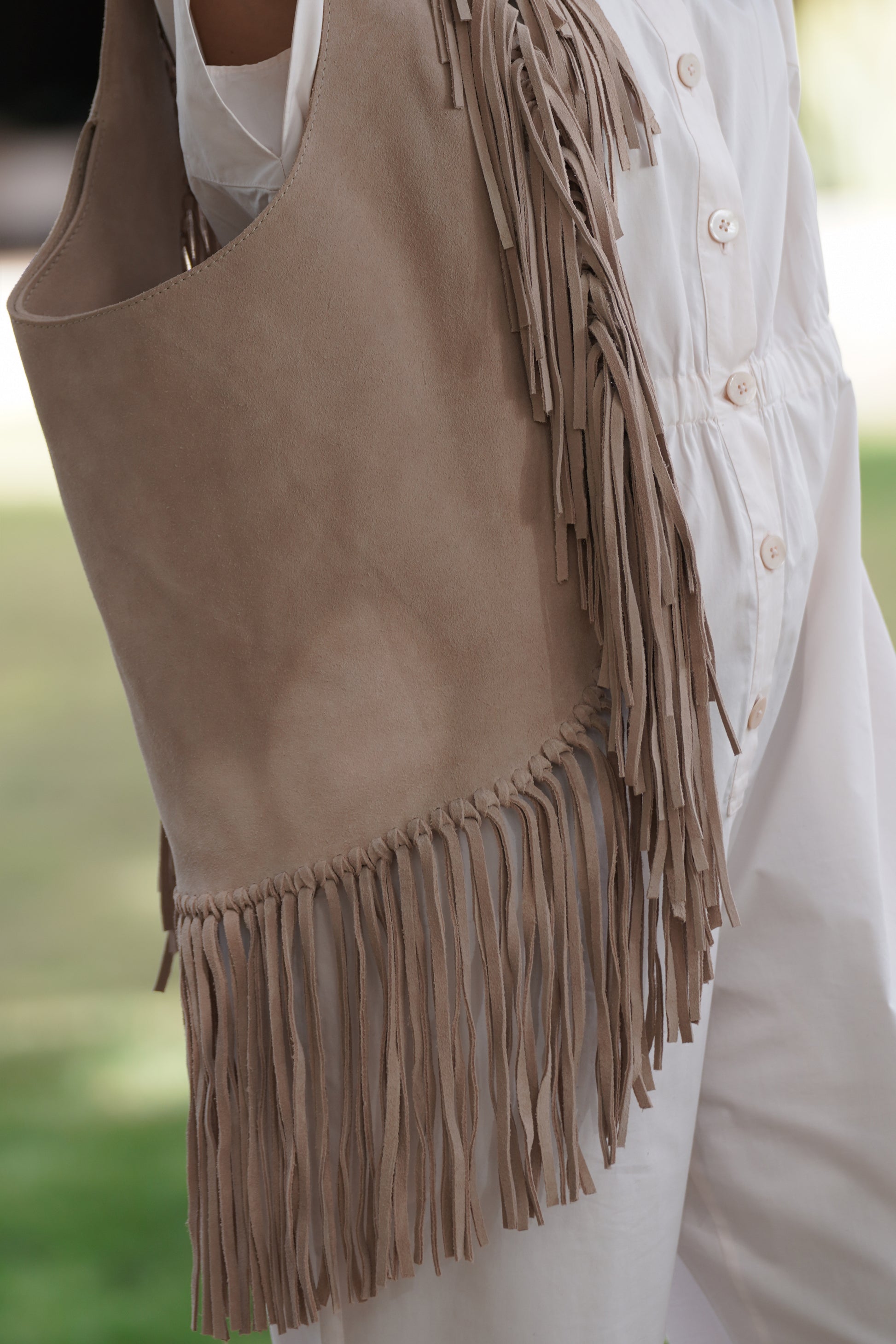 Bolsa tiracolo com franjas, feita à mão em couro bovino legítimo do tipo camurça, que confere um toque macio e visual aveludado. Corpo e franja no mesmo material, criando um efeito contínuo e elegante. Forro de brim. Modelo sem fechamento externo, com bolso interno sem zíper.