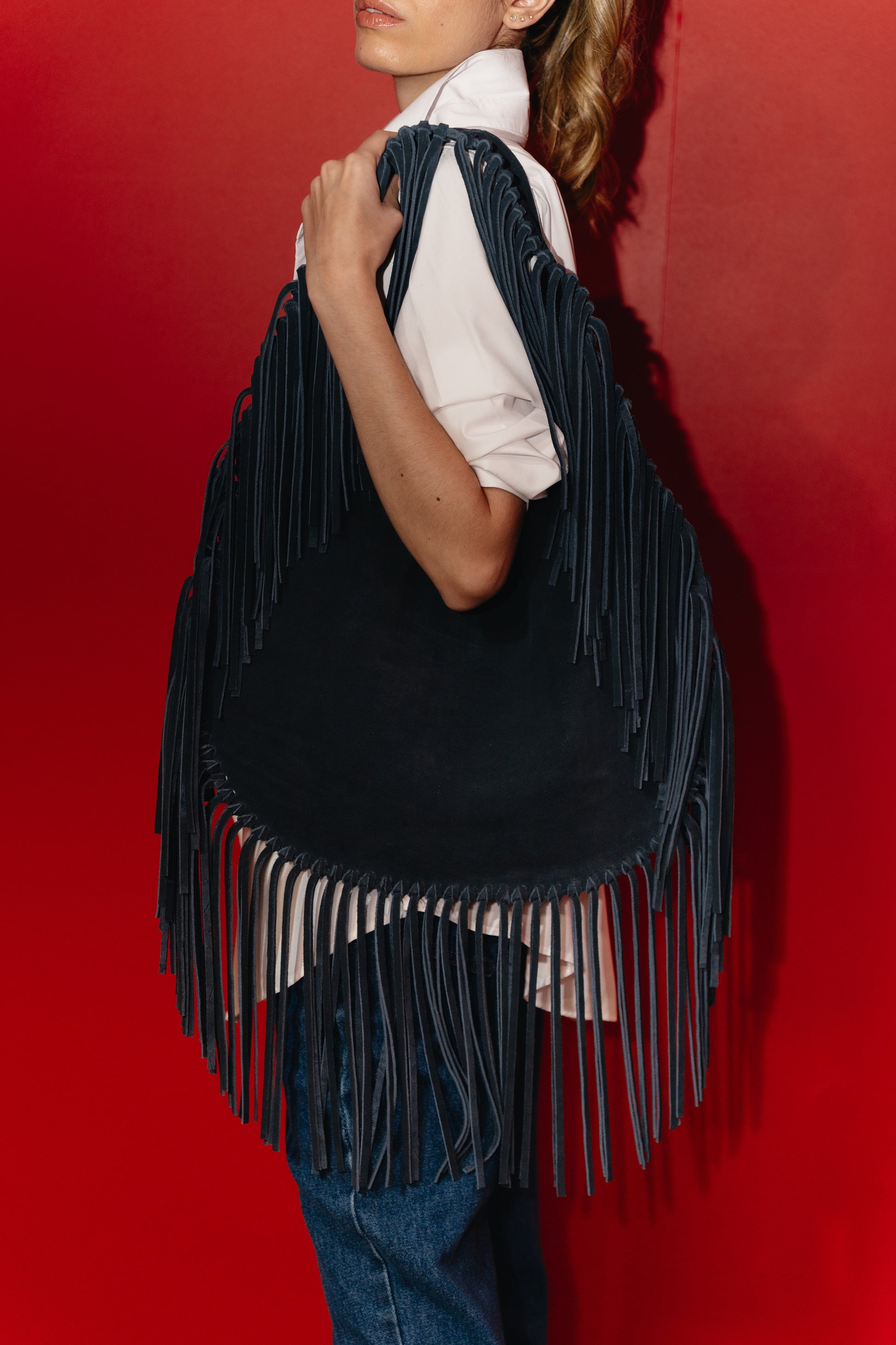 Bolsa tiracolo com franjas, feita à mão em couro bovino legítimo do tipo camurça, que confere um toque macio e visual aveludado. Corpo e franja no mesmo material, criando um efeito contínuo e elegante. Forro de brim. Modelo sem fechamento externo, com bolso interno sem zíper.