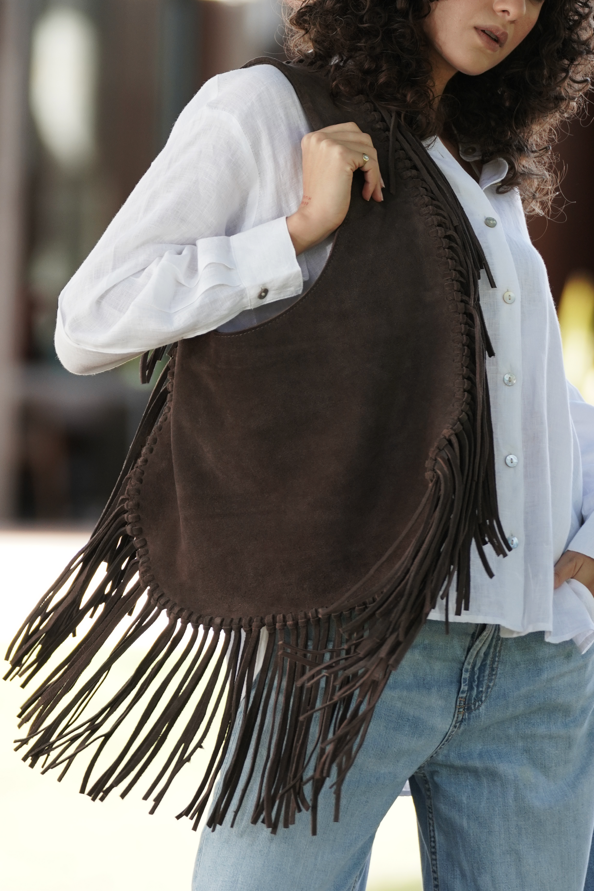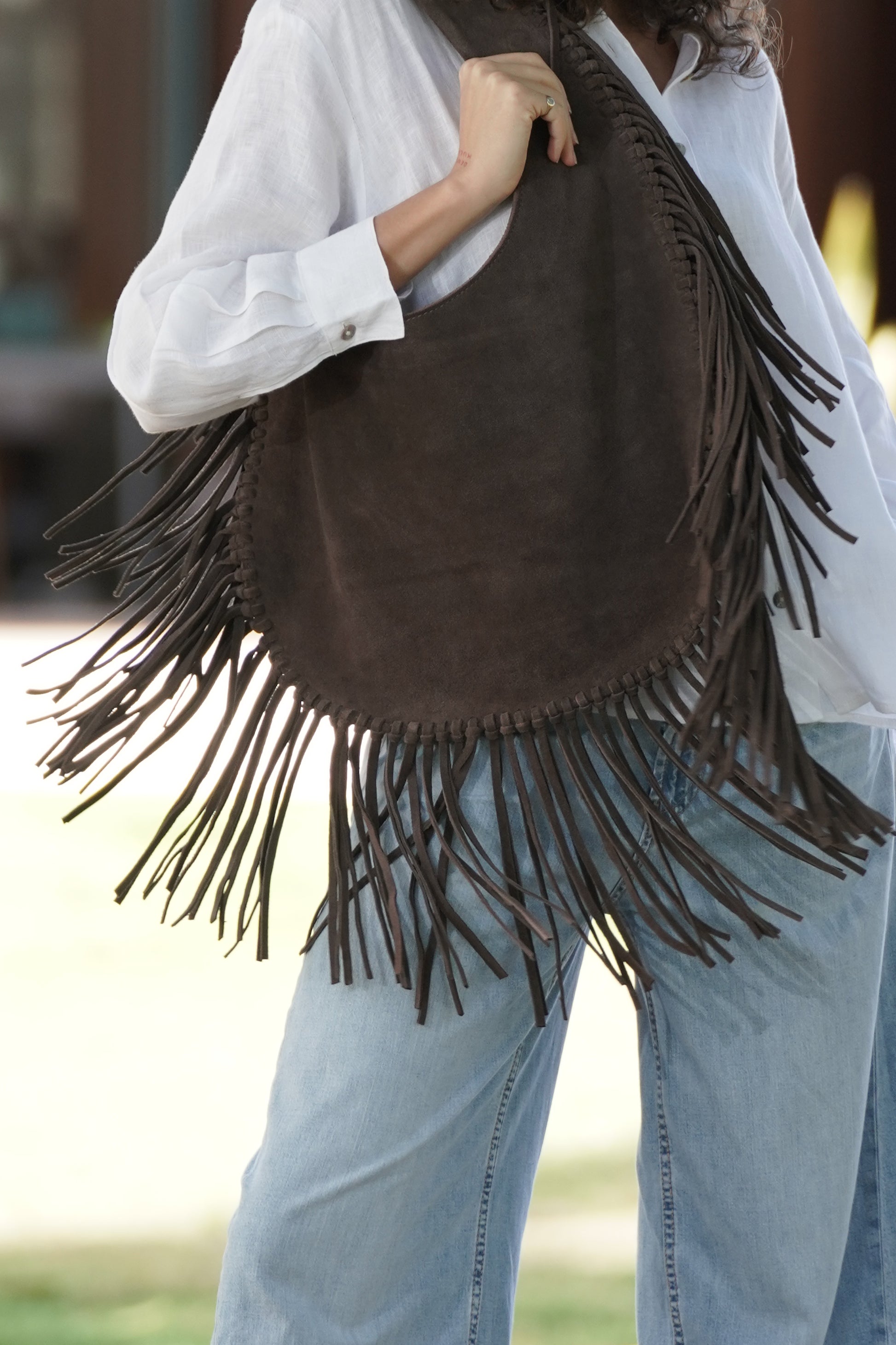 Bolsa tiracolo com franjas, feita à mão em couro bovino legítimo do tipo camurça, que confere um toque macio e visual aveludado. Corpo e franja no mesmo material, criando um efeito contínuo e elegante. Forro de brim. Modelo sem fechamento externo, com bolso interno sem zíper.