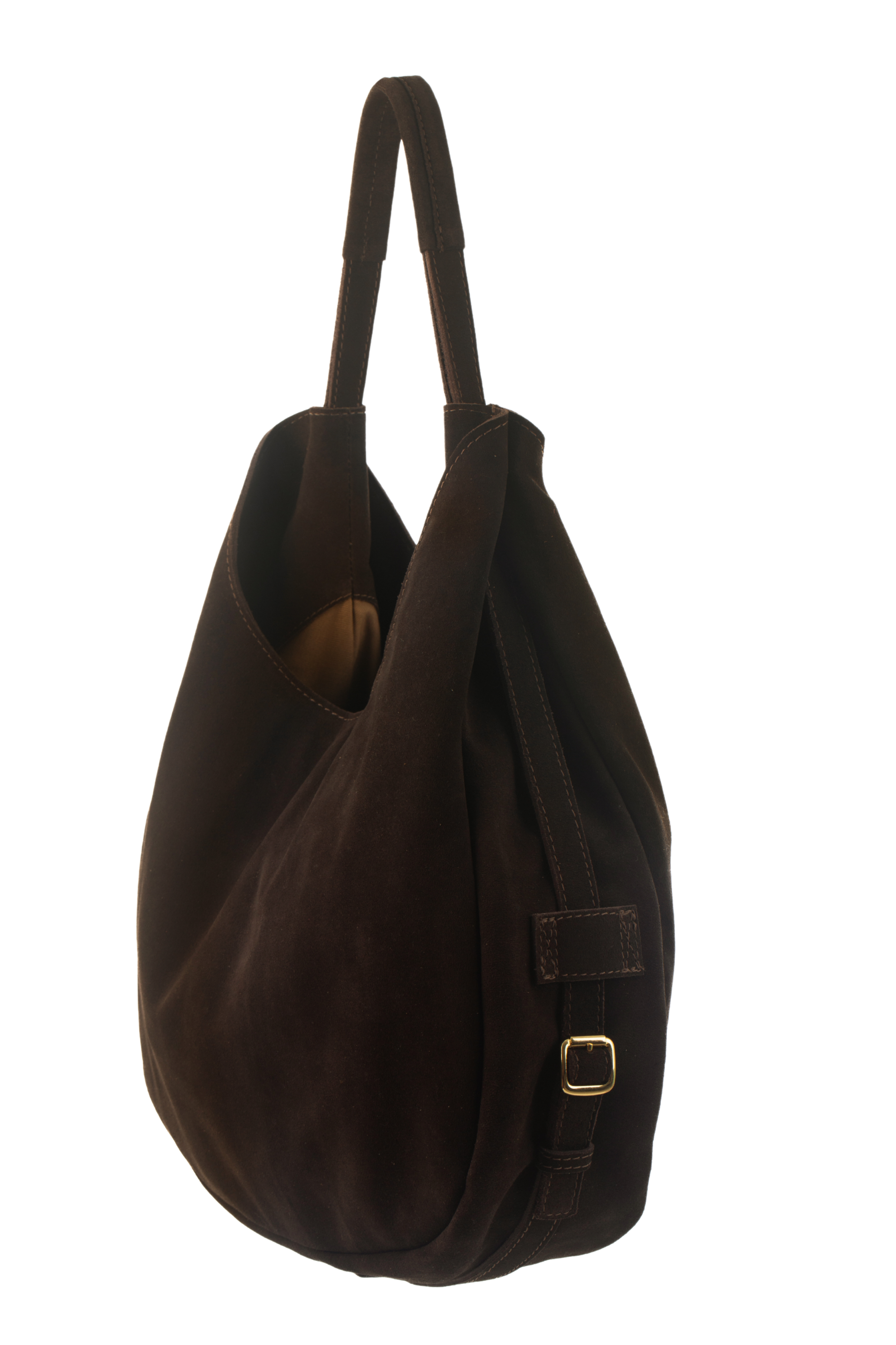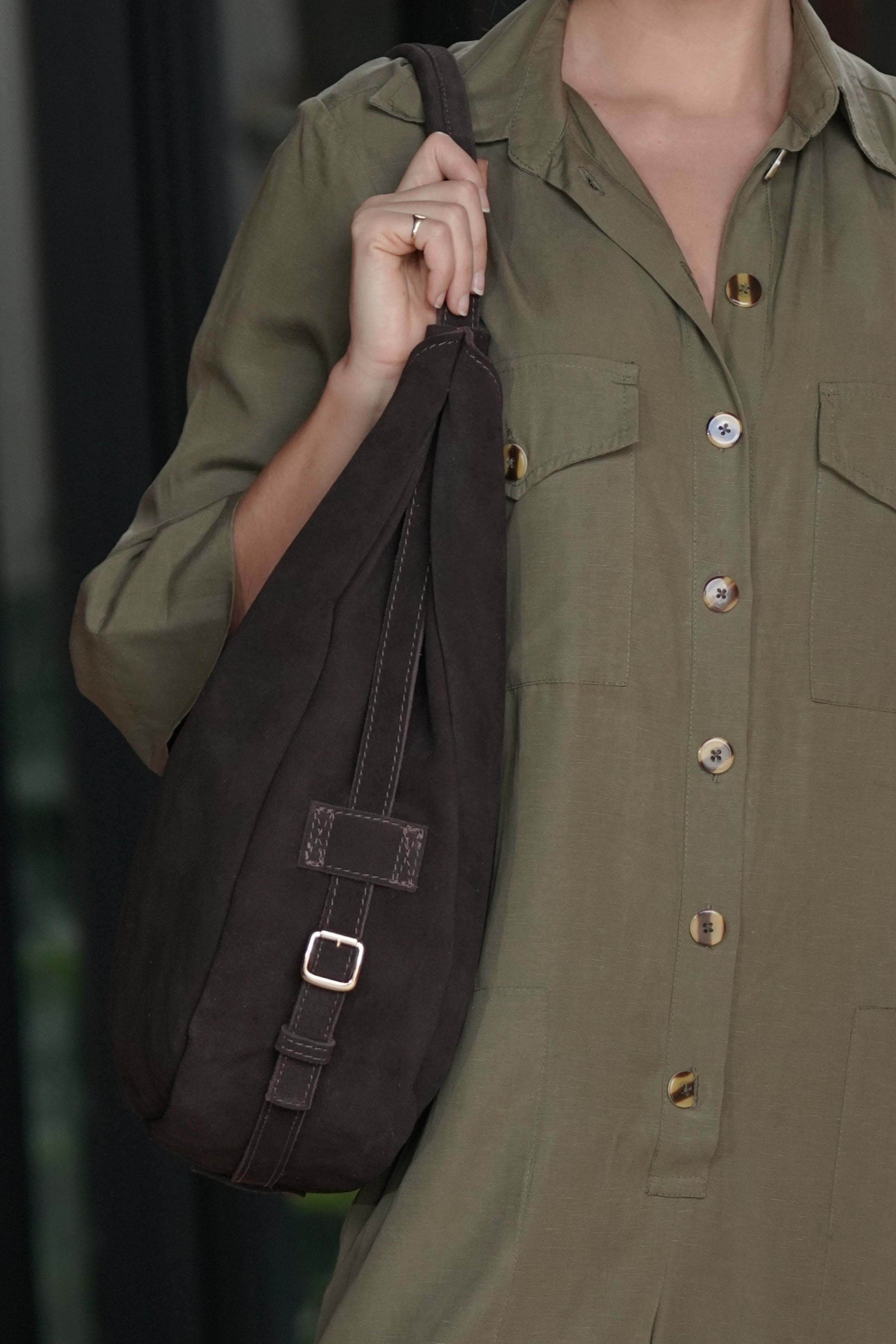 Bolsa tiracolo feita à mão em couro bovino legítimo tipo camurça, de toque aveludado e acabamento sofisticado. Detalhe em fivela metálica dourada. Modelo sem fechamento externo. Forro de brim e bolso interno com zíper.