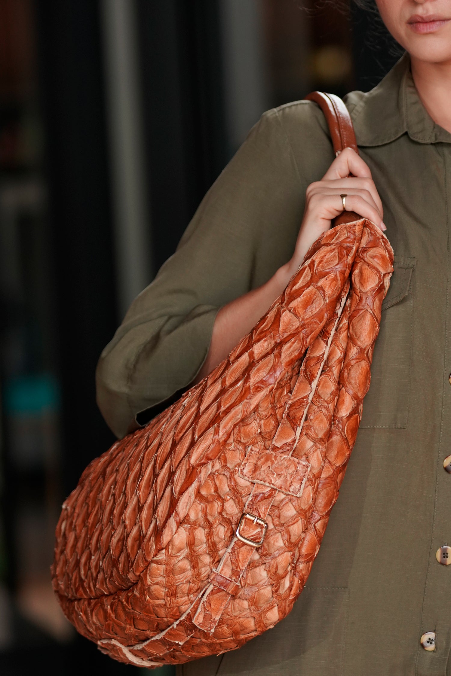 Feita à mão em couro de pirarucu, exótico, resistente e naturalmente texturizado, esta bolsa tiracolo valoriza a singularidade de cada peça e o trabalho artesanal em cada detalhe. O modelo traz fivela metálica dourada, forro de brim e bolso interno com zíper. Sem fechamento externo, mantém a leveza e a praticidade com elegância.