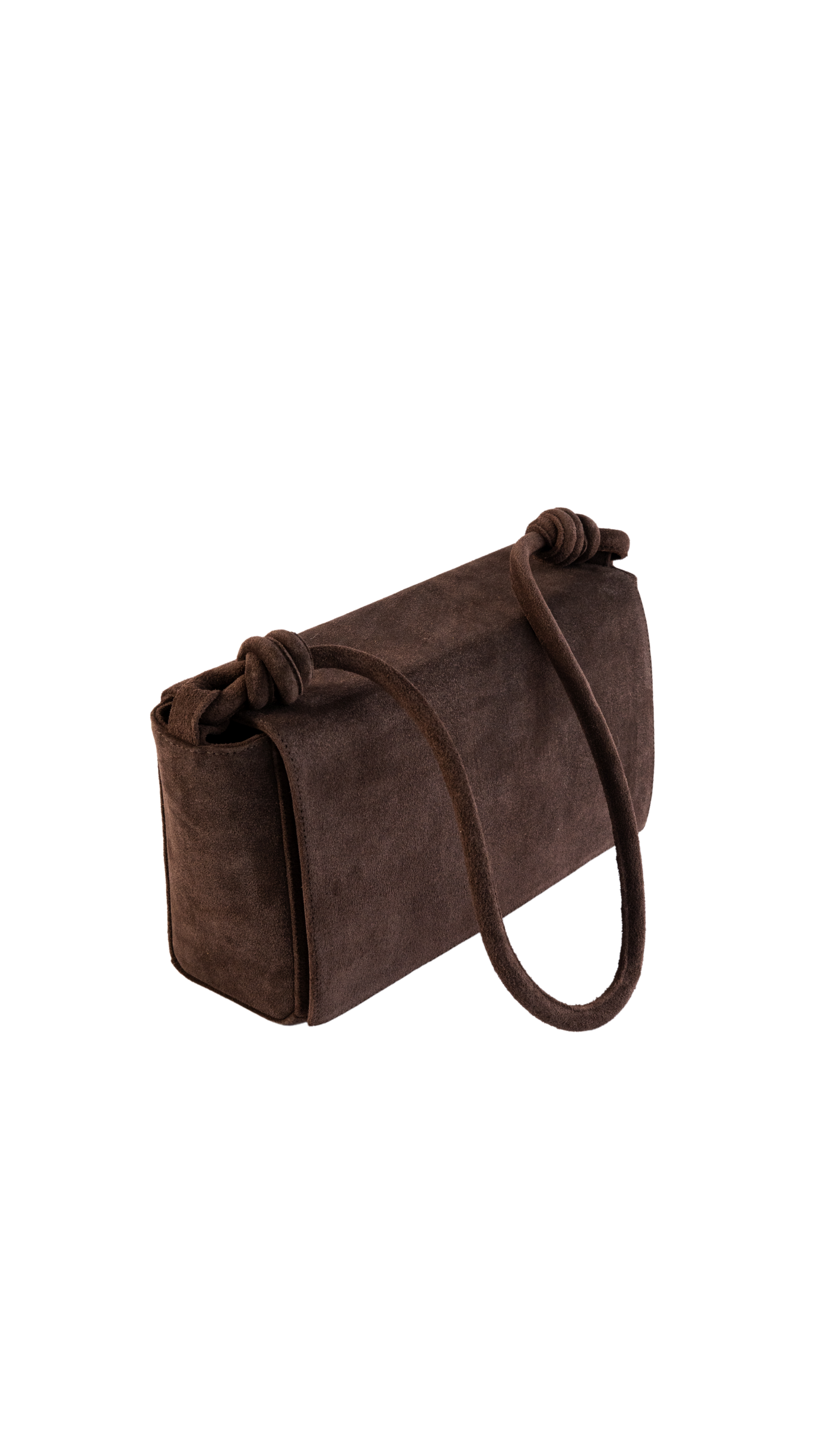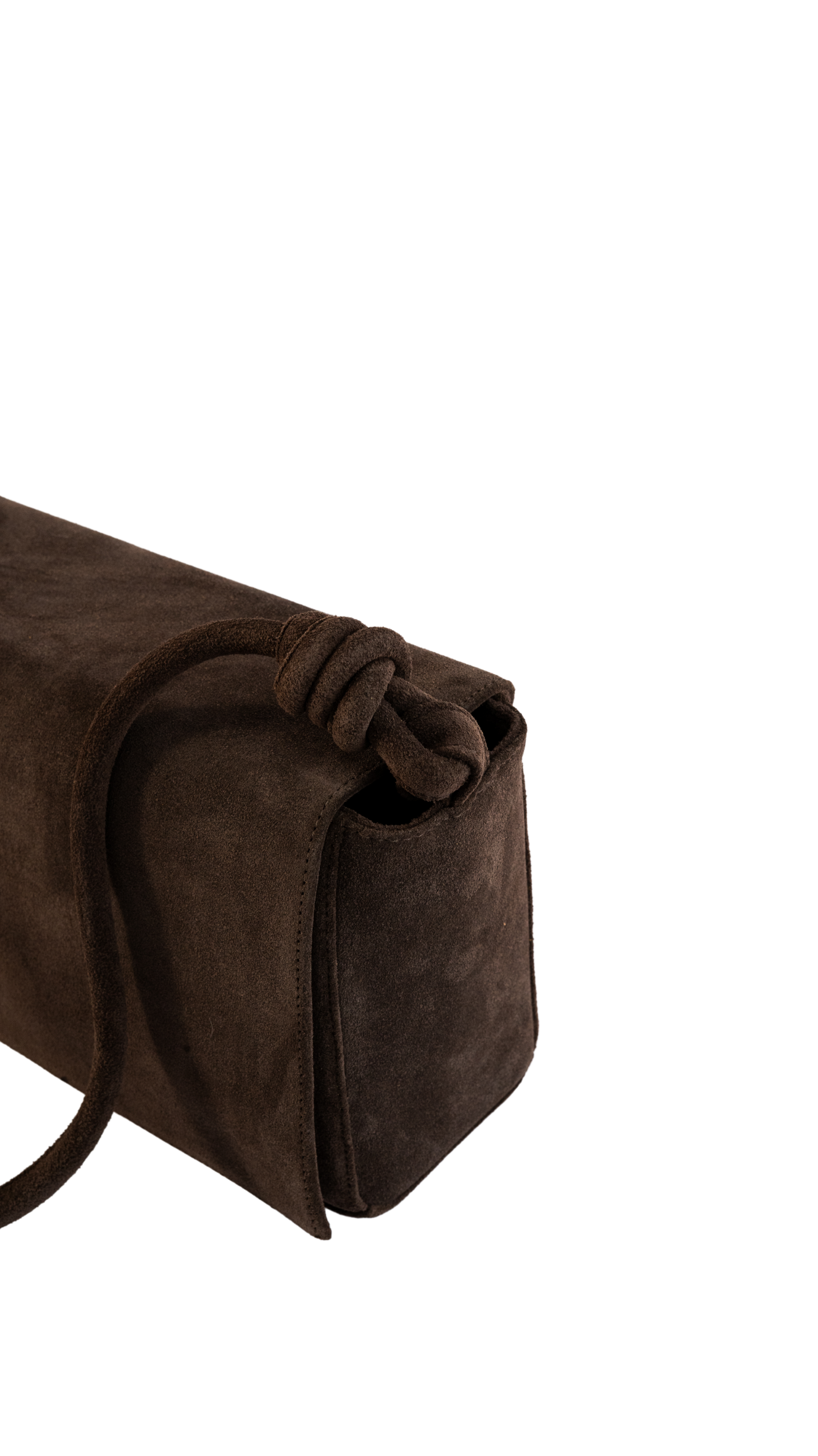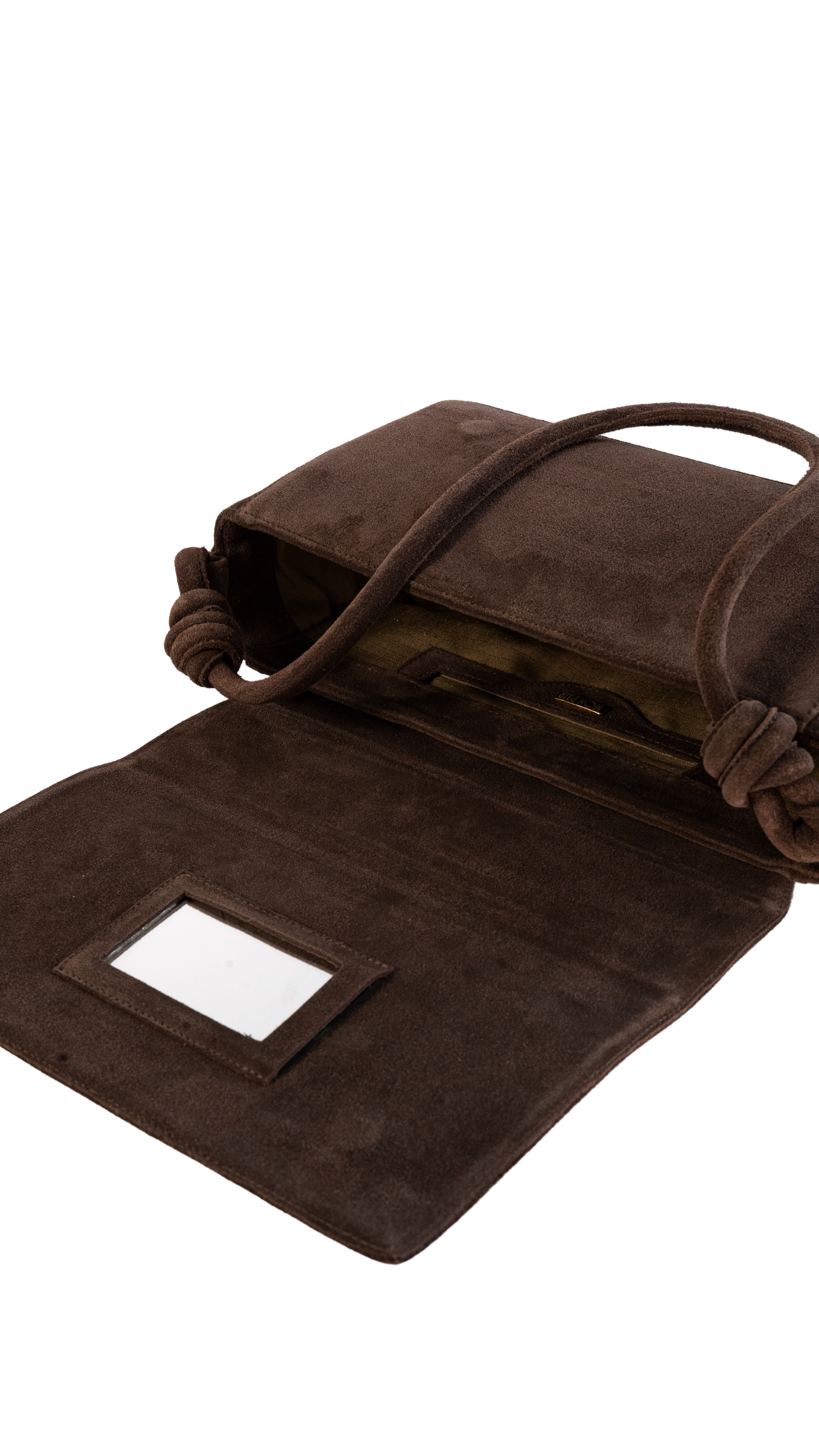 Bolsa tiracolo feita à mão em couro bovino legítimo tipo camurça. Alça com detalhe em nó, forro de brim, bolso interno sem zíper e espelho fixado na parte interna da tampa. Uma peça que combina suavidade, praticidade e charme artesanal.