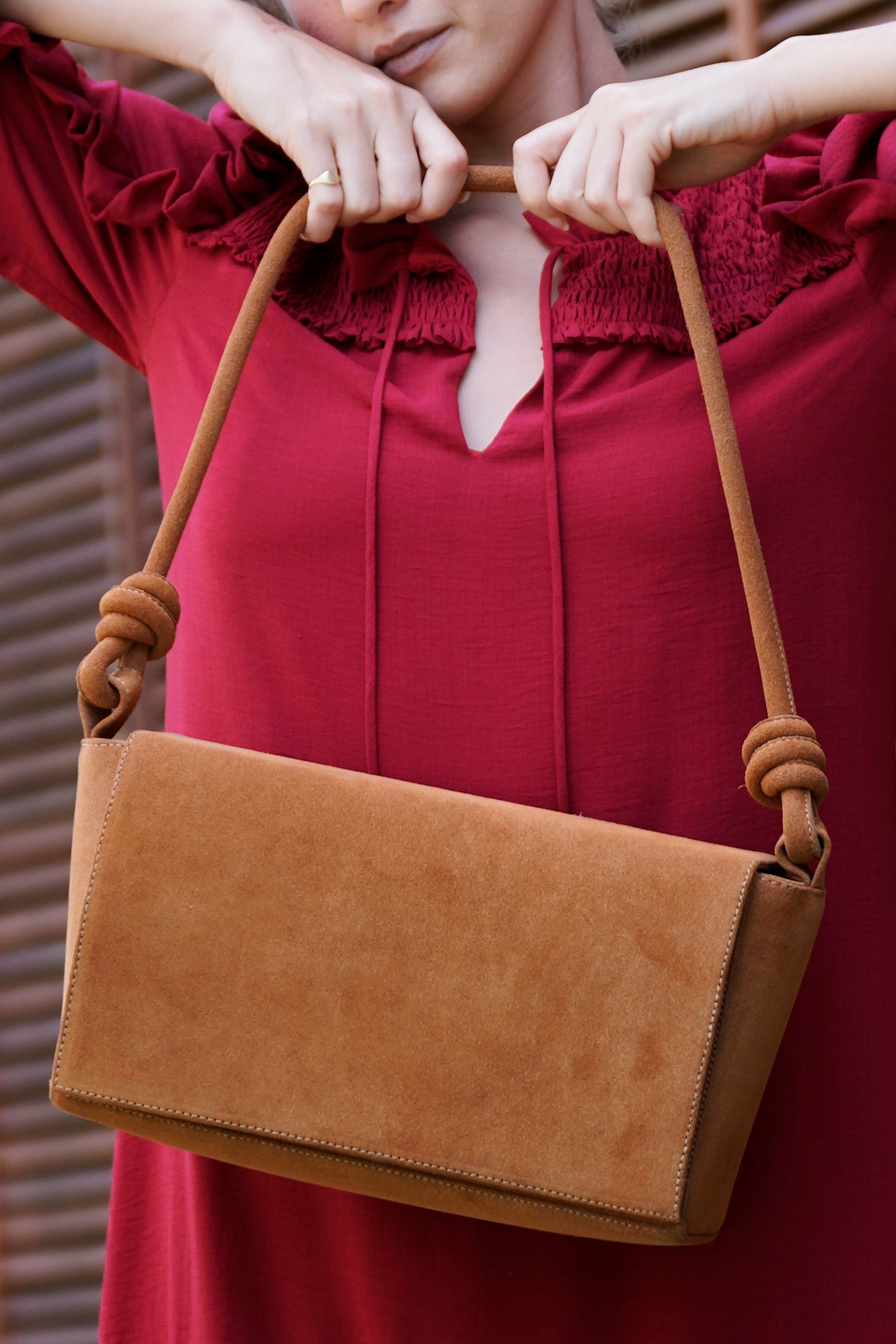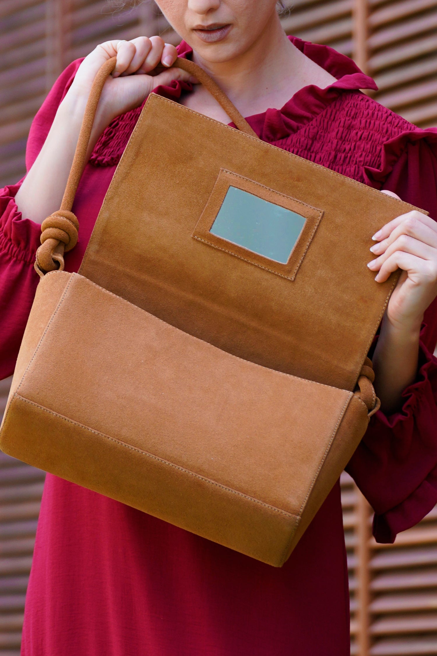 Bolsa tiracolo feita à mão em couro bovino legítimo tipo camurça. Alça com detalhe em nó, forro de brim, bolso interno sem zíper e espelho fixado na parte interna da tampa. Uma peça que combina suavidade, praticidade e charme artesanal.