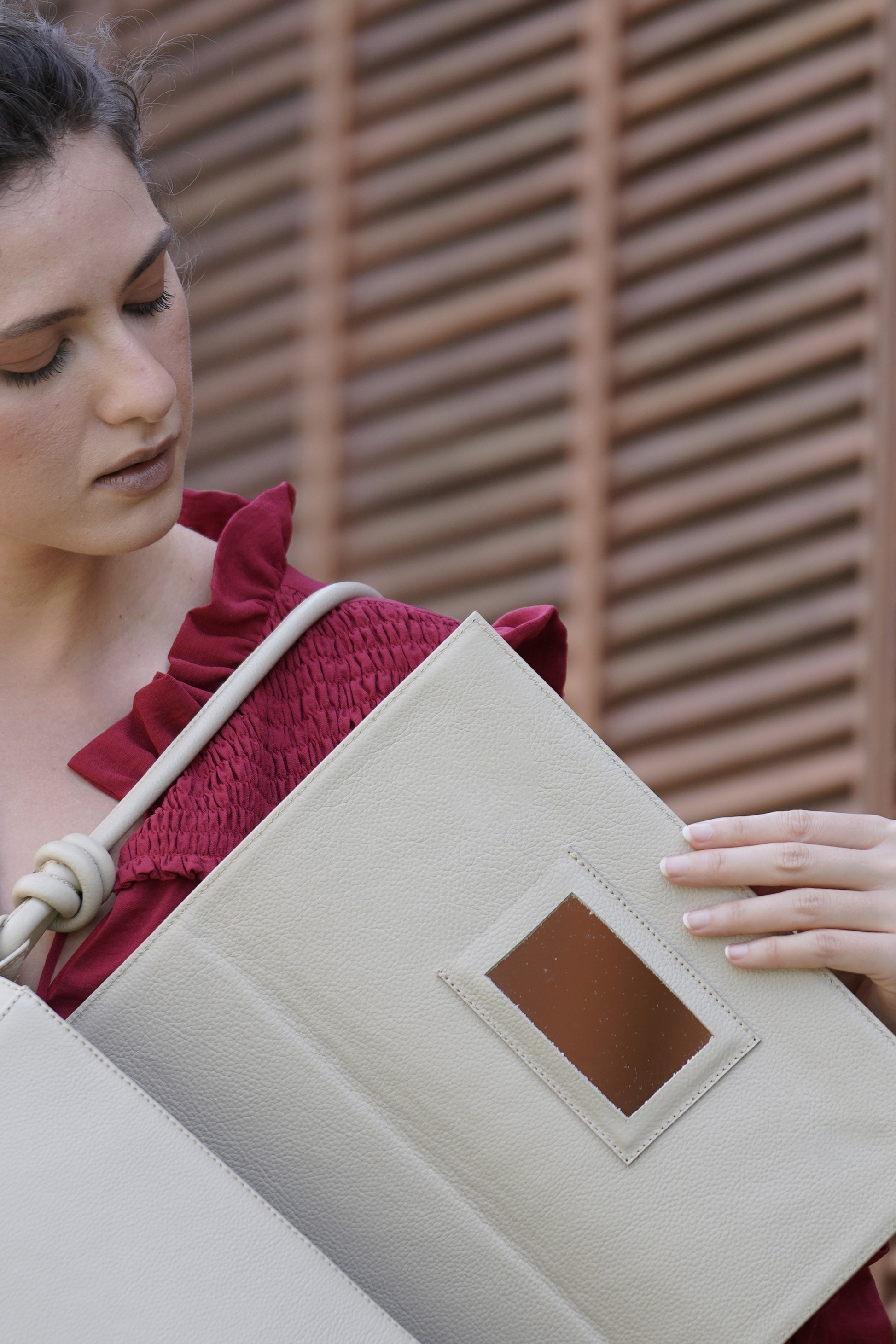 Bolsa tiracolo feita à mão em couro bovino legítimo com alça de ombro e detalhe em nó. Forro de brim. Um bolso interno sem zíper e espelho fixado na parte interna.