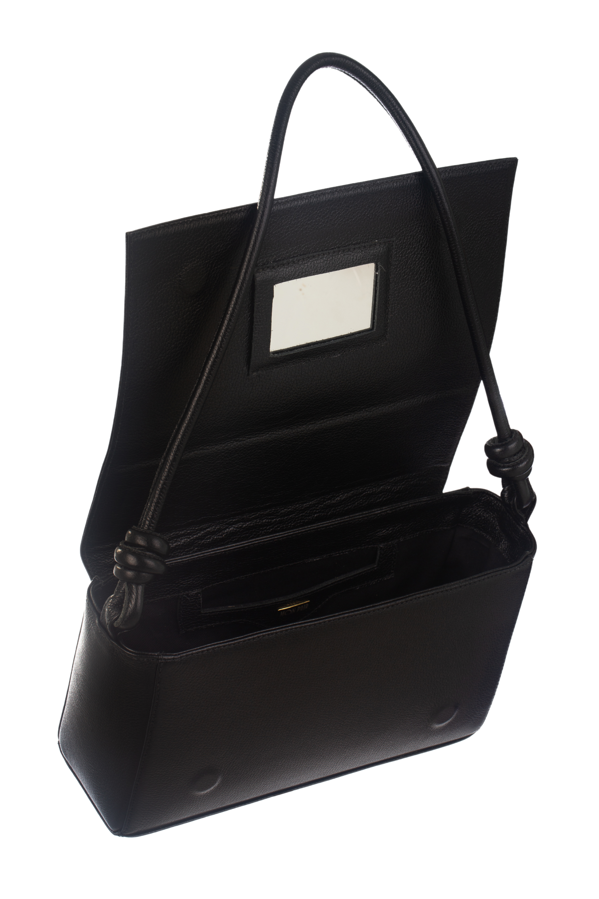 Bolsa tiracolo feita à mão em couro bovino legítimo com alça de ombro e detalhe em nó. Forro de brim. Um bolso interno sem zíper e espelho fixado na parte interna.