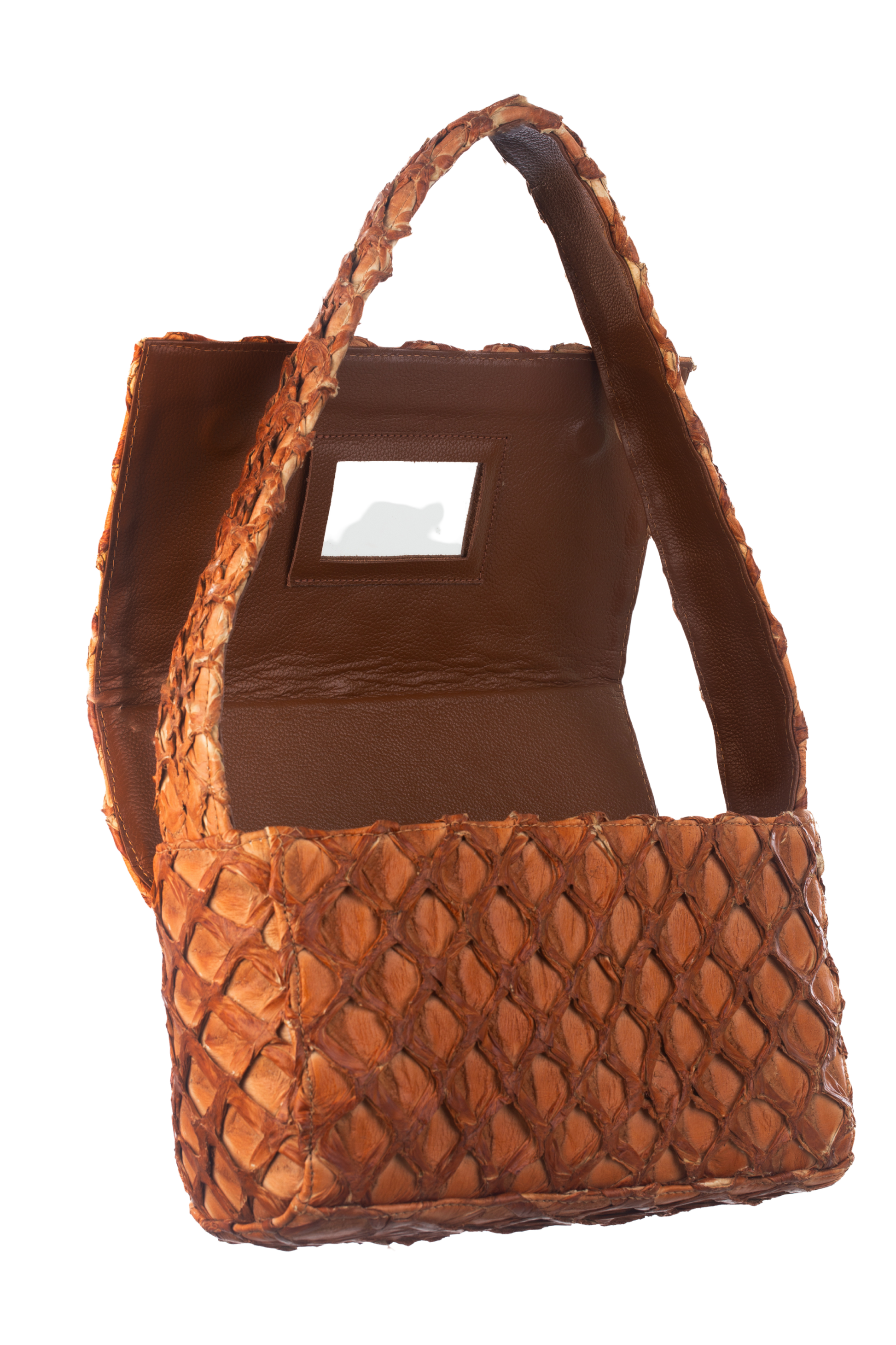 Bolsa tiracolo feita à mão em couro natural de pirarucu — exótico, resistente e de textura marcante. Forro de brim, bolso interno sem zíper e espelho fixado na parte interna da tampa. Um clássico atemporal da Mon Pair, onde o artesanal encontra a sofisticação.
