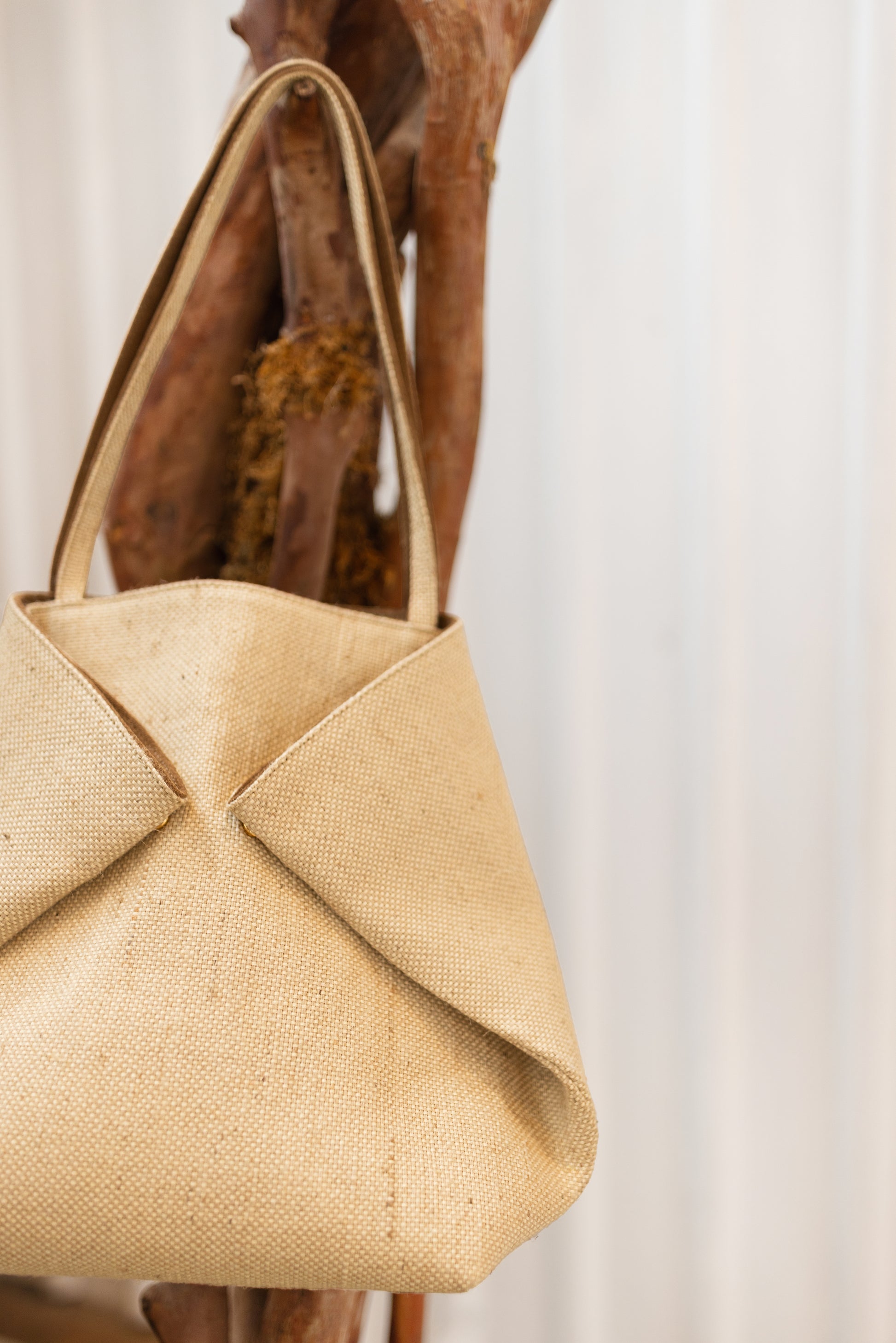 Bolsa tiracolo feita à mão em palha indiana do miolo do bambu, material natural de textura delicada e acabamento artesanal que confere personalidade e sofisticação à peça. Apresenta dobras estruturadas na parte frontal, fixadas por dois botões, adicionando detalhe exclusivo ao design. Parte interna totalmente forrada em camurça.