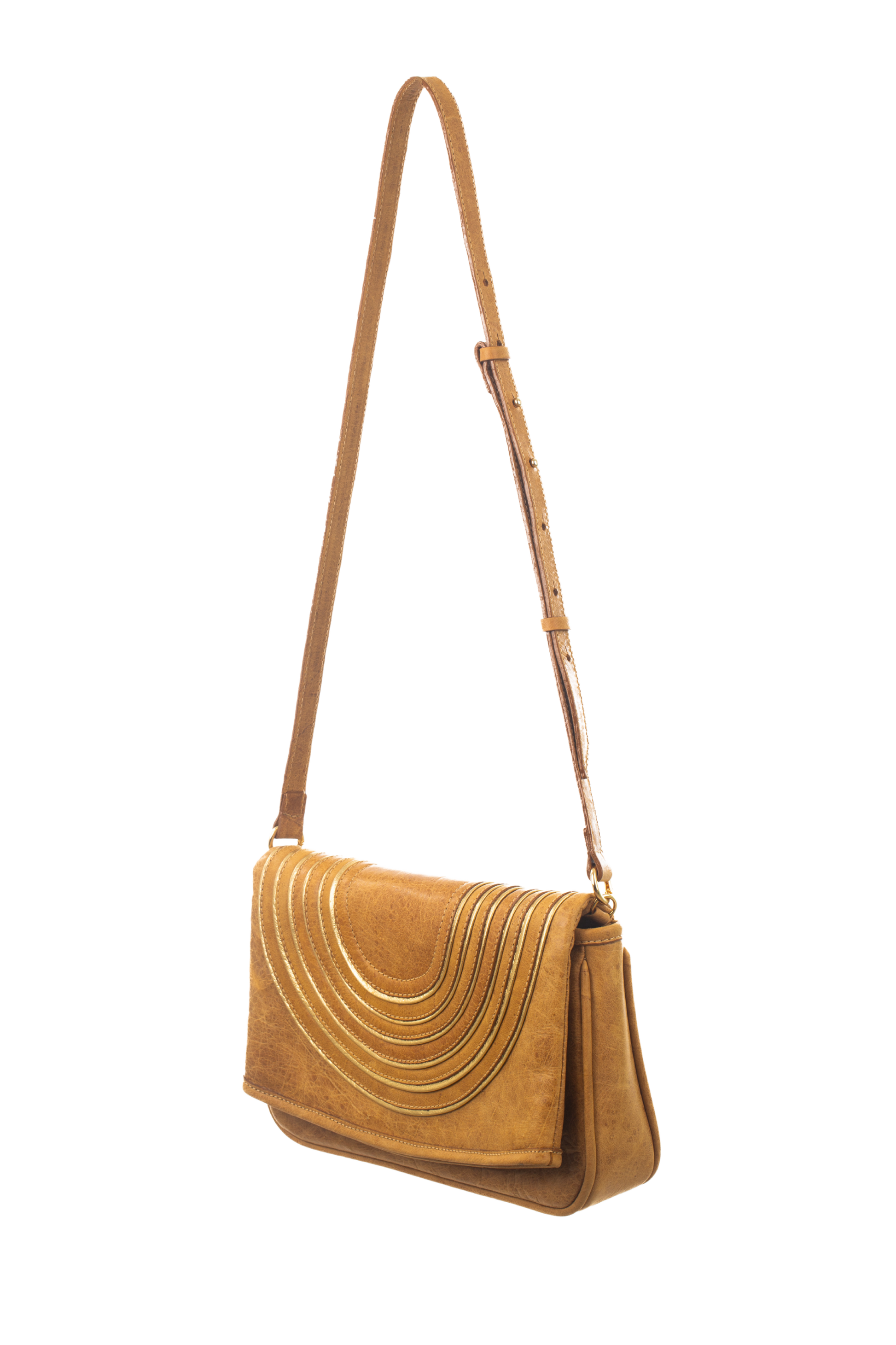Bolsa tiracolo feita à mão em couro bovino legítimo do tipo camurça. Tampa com detalhe em linhas ouro e metais na cor ouro. Forro de brim. Alça transversal removível e regulável, além de alça curta também removível. Um bolso interno sem zíper e um bolso externo com zíper.