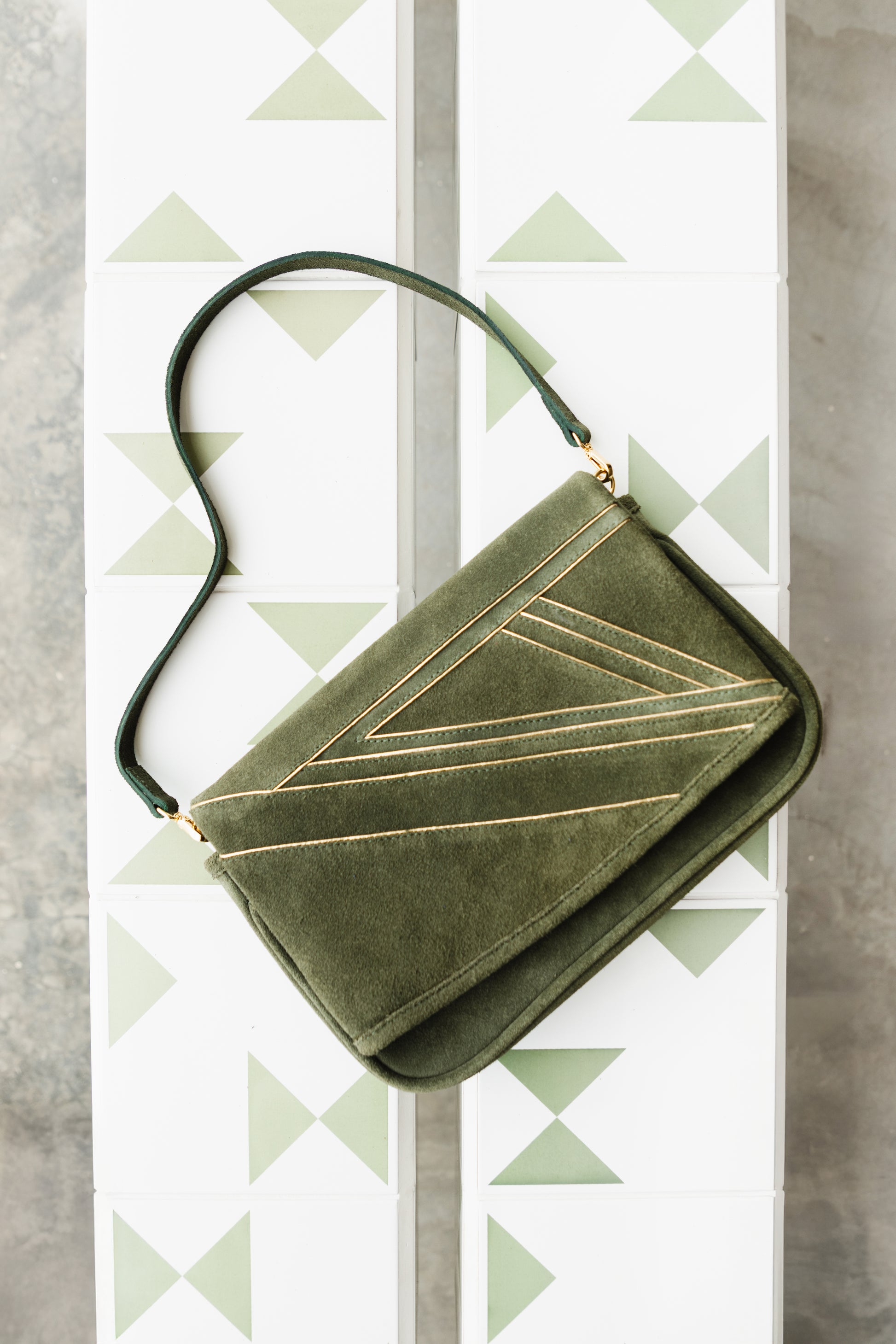 Bolsa feita à mão em couro legítimo do tipo camurça, material que valoriza a delicadeza da peça. Apresenta detalhes em linhas douradas na parte frontal, adicionando sofisticação e um toque de elegância ao design. Possui alça curta e alça longa, ambas removíveis, e fechamento por botão invisível. Possui bolso interno sem zíper e um bolso externo com zíper.